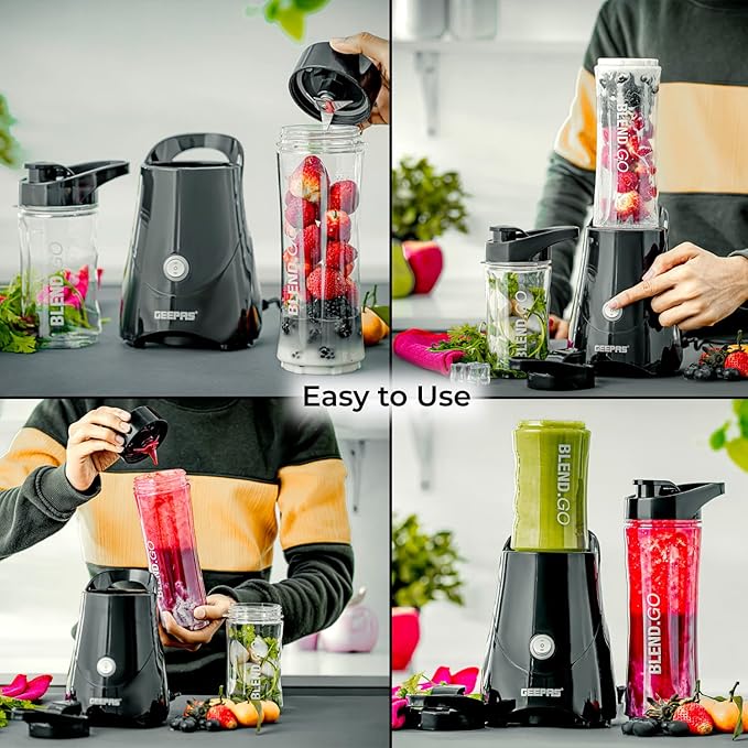 Geepas Kişisel Blender güçlü 500W motoru ve 570 ml kapasiteli plastik spor şişeleriyle, hızlı ve pratik bir şekilde smoothie, protein içecekleri ve diğer karışımlar hazırlamanıza olanak tanır. Şık siyah tasarımıyla mutfakta ve spor salonunda kullanım için ideal bir üründür.